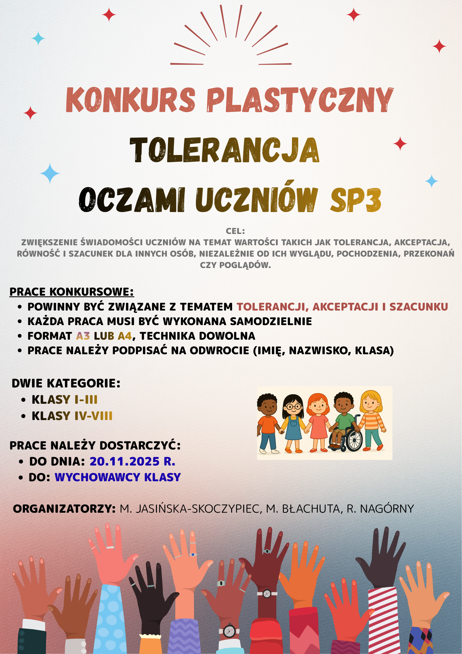 Czy potrafisz pokazać, że różnorodność to wartość, a nie bariera? Zapraszamy wszystkich uczniów klas I–VIII Szkoły Podstawowej nr 3 w Sanoku do udziału w konkursie plastycznym poświęconym tolerancji, akceptacji i równości.