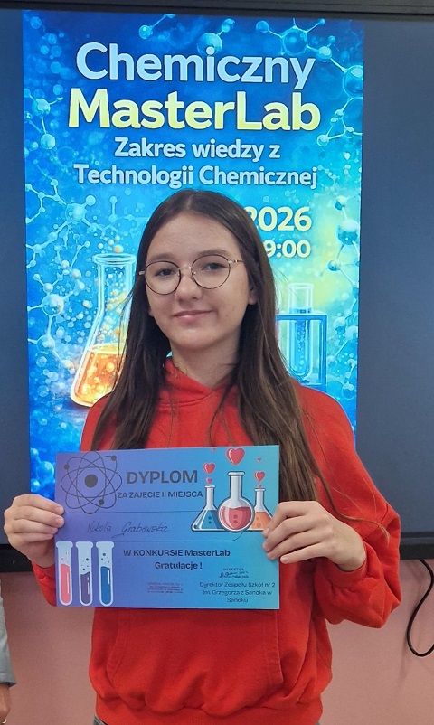 Z dumą informujemy, że 27 marca 2026 roku w Zespole Szkół nr 2 w Sanoku odbył się prestiżowy konkurs z technologii chemicznej – MasterLab. Reprezentantki naszej szkoły wykazały się fenomenalną wiedzą, zdobywając najwyższe miejsca na podium!