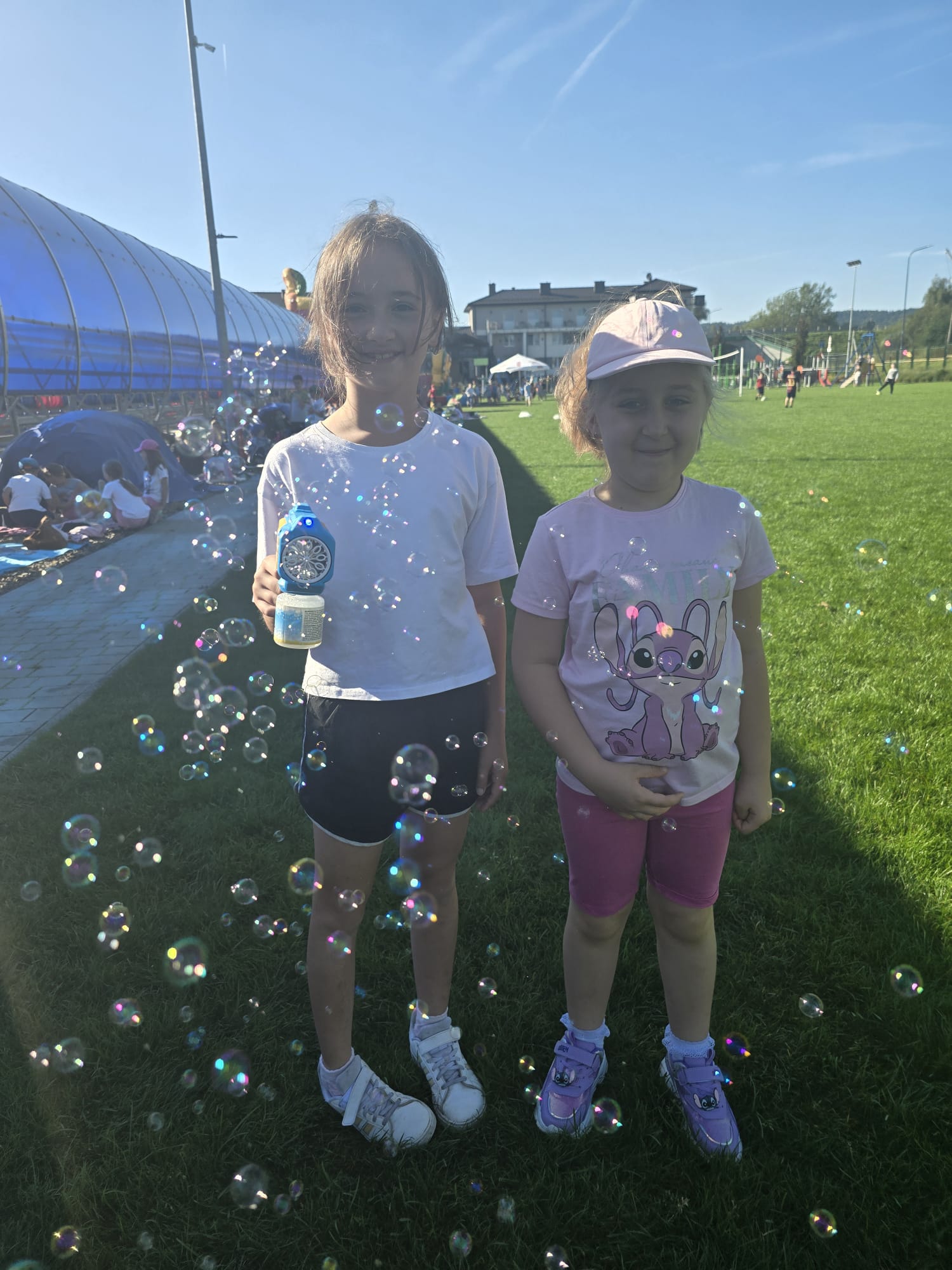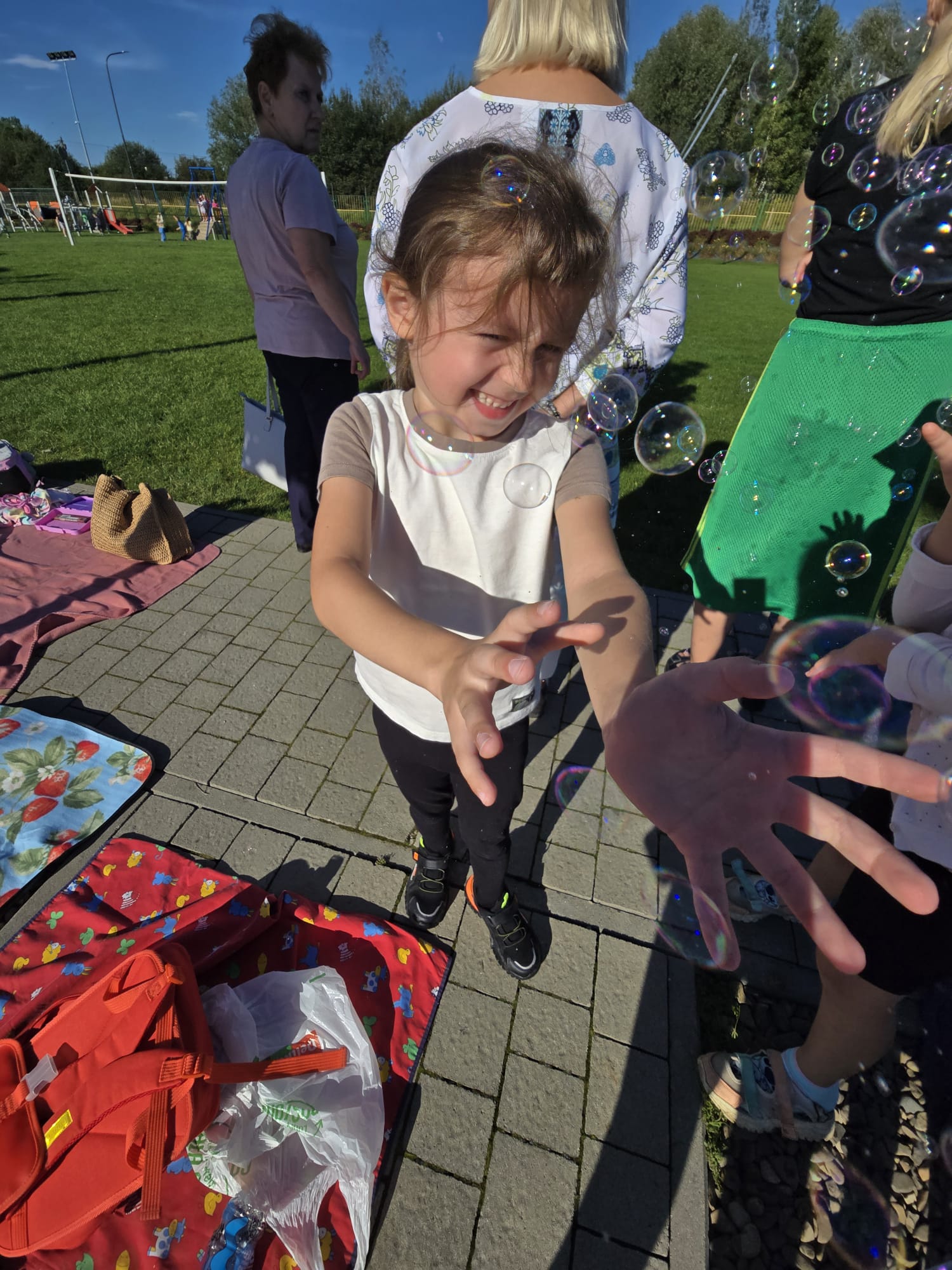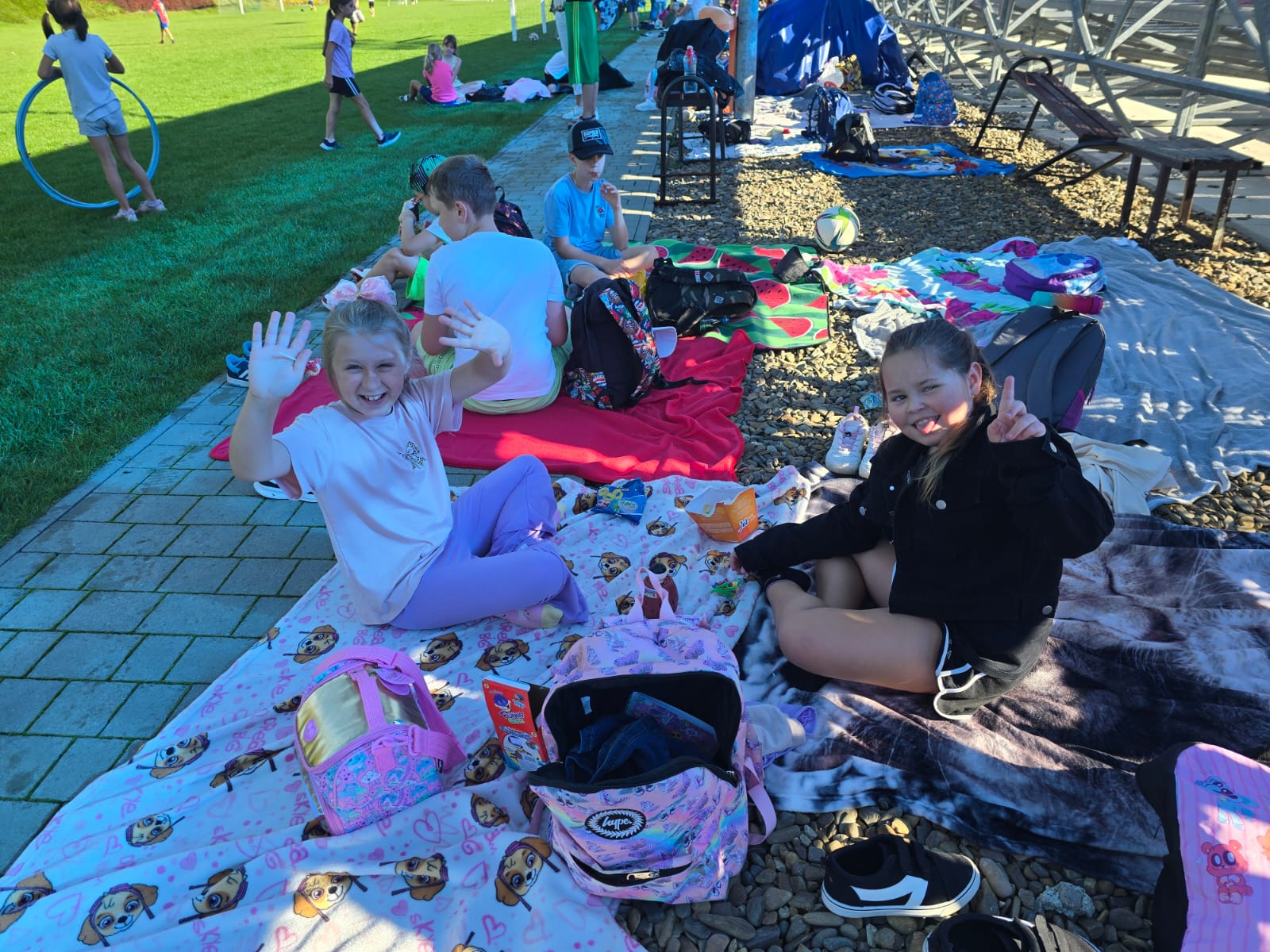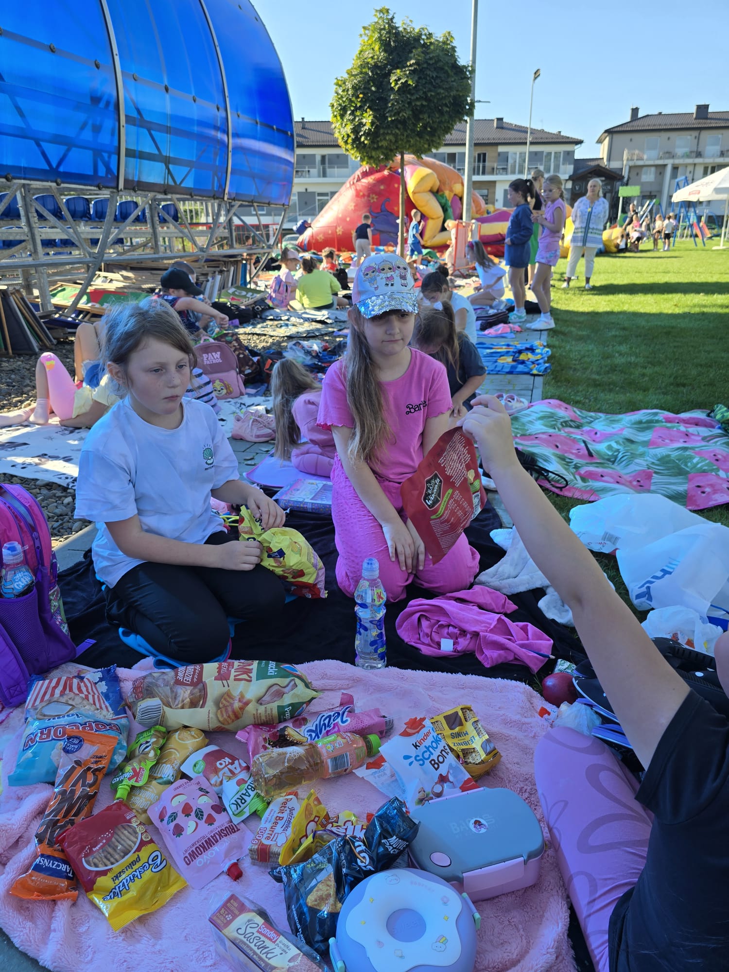 Wszystko nam sprzyja tego dnia - wspaniała pogoda, doskonałe humory i plecaki załadowane smakołykami. Dzieci na kocykach zajadają pyszności, grają w gry planszowe oraz karciane. Na stadionie w tym czasie rozgrywane są mecze piłki nożnej wśród naszych uczniów oraz inne rozgrywki sportowe. W powietrzu unoszą się pięknie mieniące się bańki mydlane. Dzięki uprzejmości właściciela obiektu - Pana Jerzego Domaradzkiego, dzieci mogą korzystać również z wszystkich atrakcji dostępnych przy stadionie - z siłowni zewnętrznej, drążków, ścianki wspinaczkowej, stołu tenisowego, tyrolki oraz z dmuchańca. Ta ostatnia atrakcja przyciągnęła długie kolejki chętnych amatorów zjeżdżania.