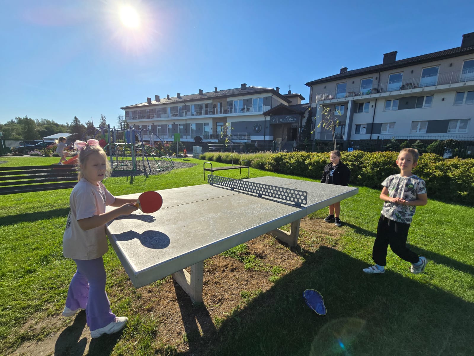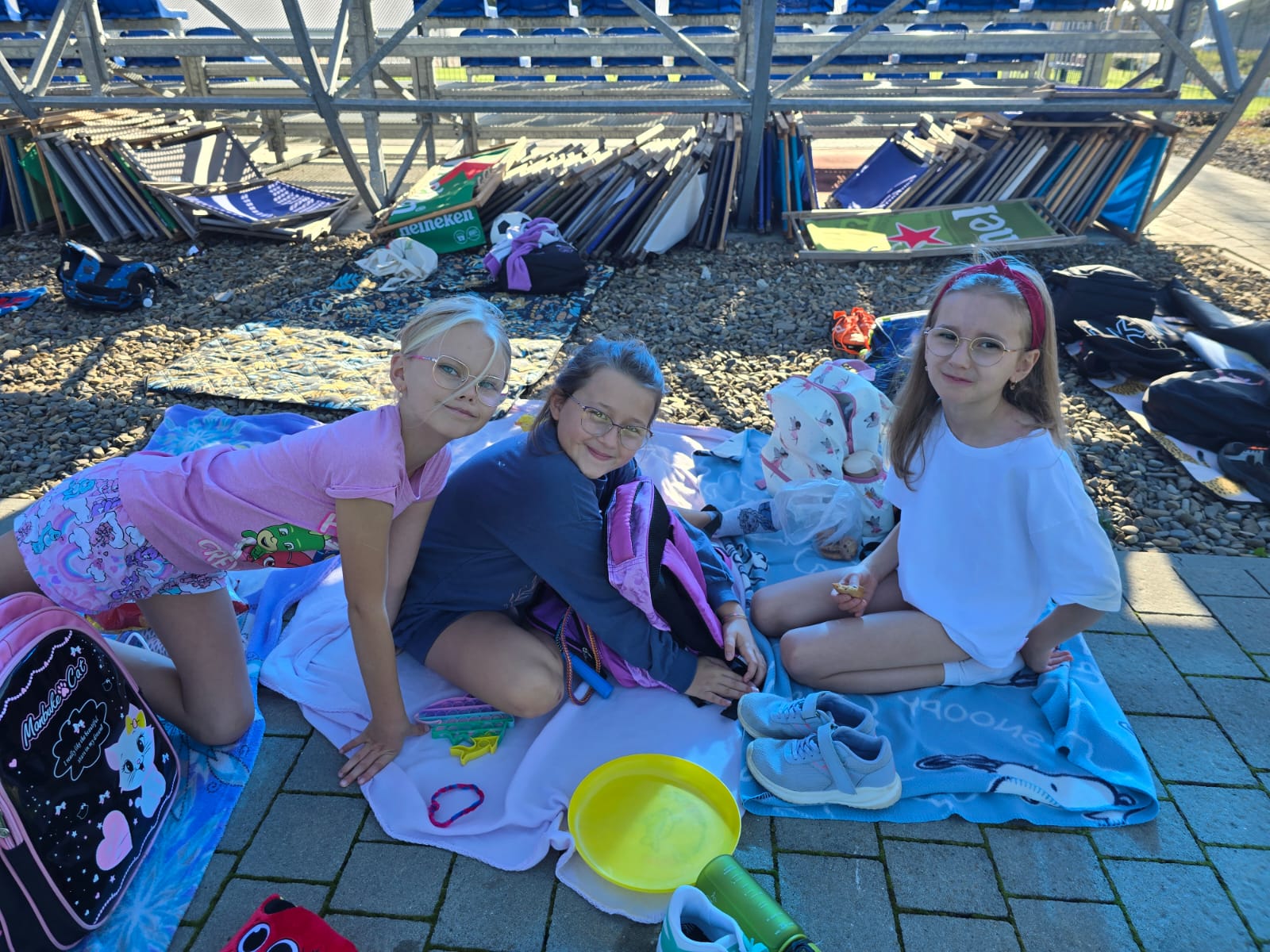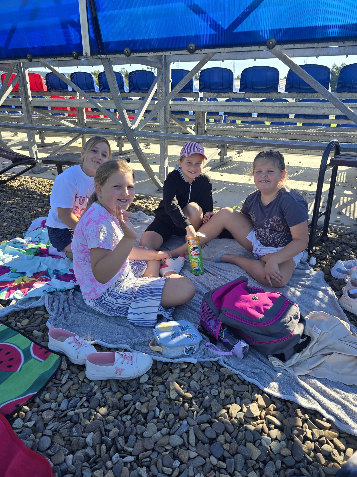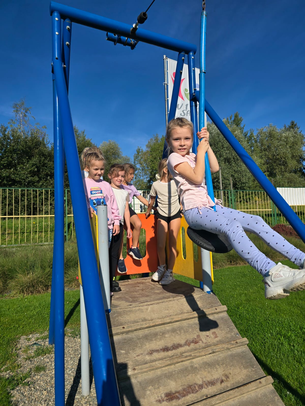 Wszystko nam sprzyja tego dnia - wspaniała pogoda, doskonałe humory i plecaki załadowane smakołykami. Dzieci na kocykach zajadają pyszności, grają w gry planszowe oraz karciane. Na stadionie w tym czasie rozgrywane są mecze piłki nożnej wśród naszych uczniów oraz inne rozgrywki sportowe. W powietrzu unoszą się pięknie mieniące się bańki mydlane. Dzięki uprzejmości właściciela obiektu - Pana Jerzego Domaradzkiego, dzieci mogą korzystać również z wszystkich atrakcji dostępnych przy stadionie - z siłowni zewnętrznej, drążków, ścianki wspinaczkowej, stołu tenisowego, tyrolki oraz z dmuchańca. Ta ostatnia atrakcja przyciągnęła długie kolejki chętnych amatorów zjeżdżania.