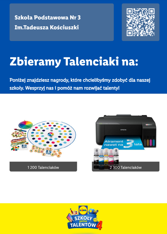 nasza szkoła bierze udział w czwartej edycji akcji sklepu Lidl – „Szkoły pełne talentów 4”. Za zrobione zakupy w tej sieci sklepów dostaje się Talenciaki, które można samodzielnie przypisać do naszej szkoły lub wrzucić do specjalnego pudełka, które znajduje się przy wejściu do szkoły. Zgromadzone w ten sposób kupony pozwolą nam zdobyć atrakcyjne nagrody. W tym roku chcielibyśmy pozyskać drukarkę firmy Epson. W ubiegłej edycji dzięki Waszemu zaangażowaniu zdobyliśmy głośnik z mikrofonem marki Medion, który świetnie sprawdza się podczas szkolnych uroczystości.