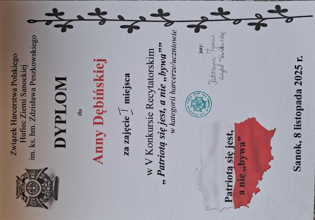 Dnia 8 listopada 2025 roku w Hufcu ZHP Ziemi Sanockiej odbył się V Powiatowy Konkurs Recytatorski „Patriotą się jest, a nie bywa”.
