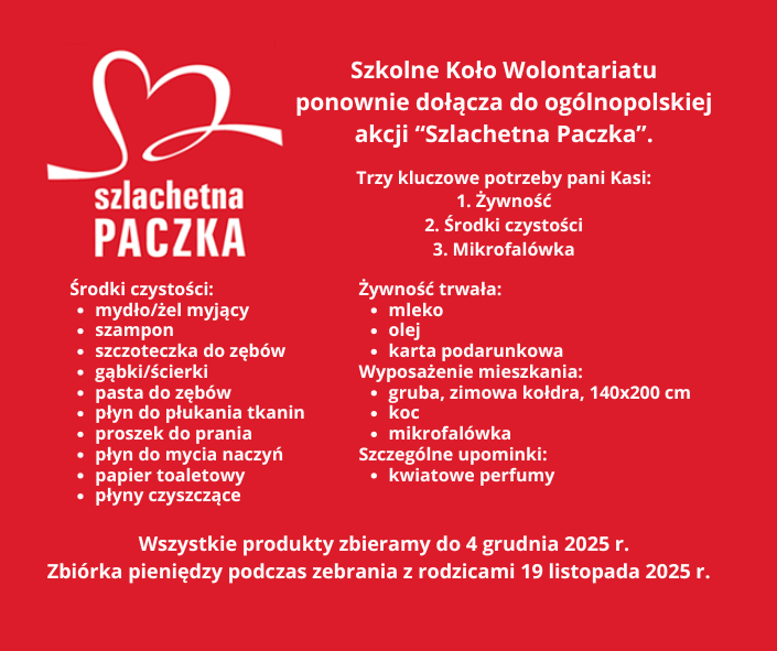 Wszystkie produkty zbieramy do 4 grudnia 2025 roku, które można składać w pudełku w holu szkoły lub u pań: Magdaleny Błachuty lub Anny Nater-Chlebińskiej. W ramach akcji zostanie również przeprowadzona zbiórka pieniędzy wśród uczniów i nauczycieli na uzupełnienie potrzeb podczas zebrania z rodzicami 19 listopada 2025 r.