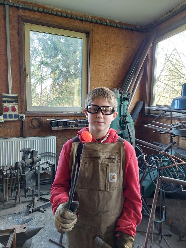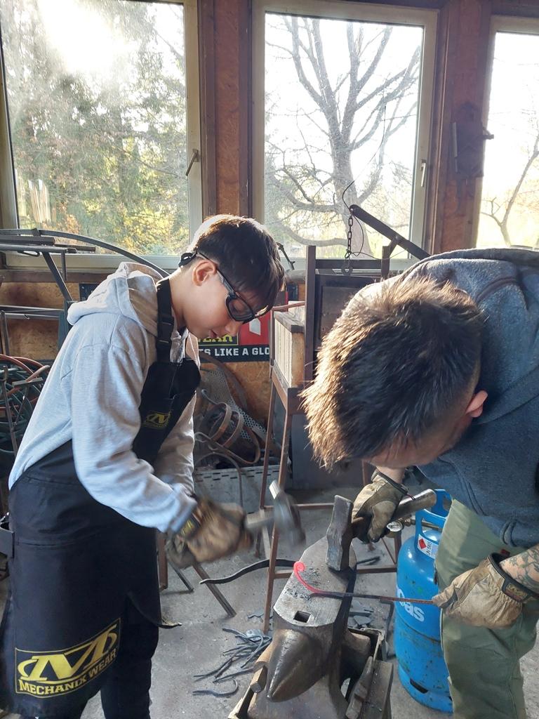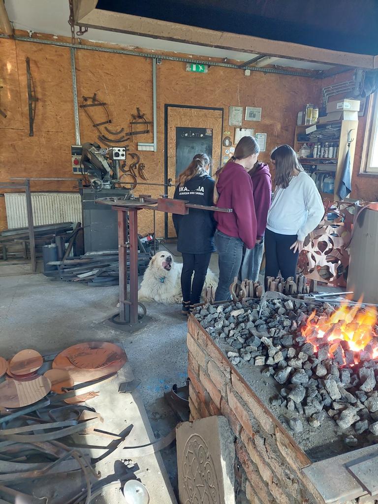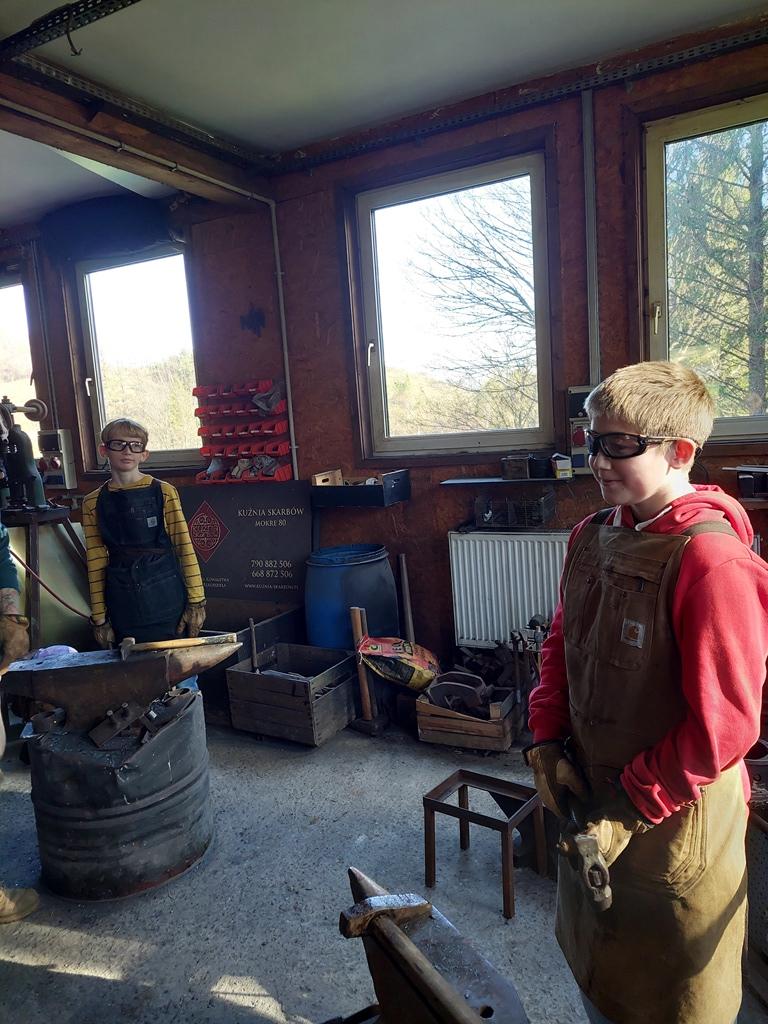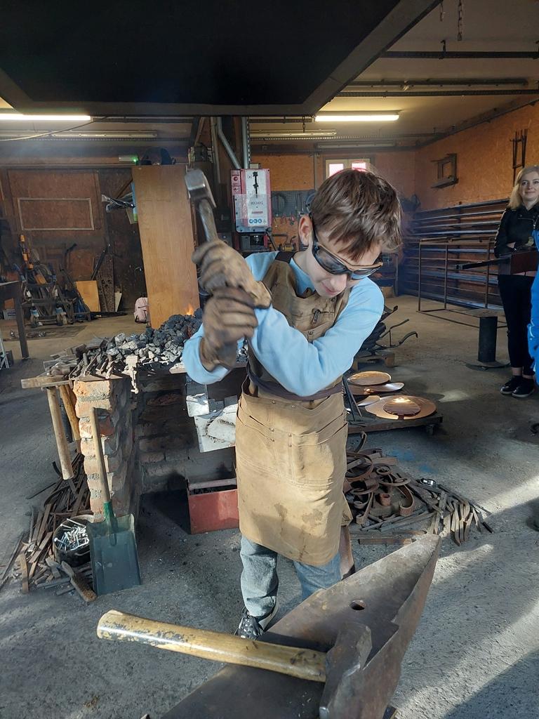 Gospodyni wprowadziła uczestników do wewnątrz punktu, gdzie opowiedziała czym zajmuje się kowal, i w jaki sposób. Następnie został przez prowadzących przygotowany warsztat pracy. Rozpalenie odpowiedniego opału do wytopienia metalu.