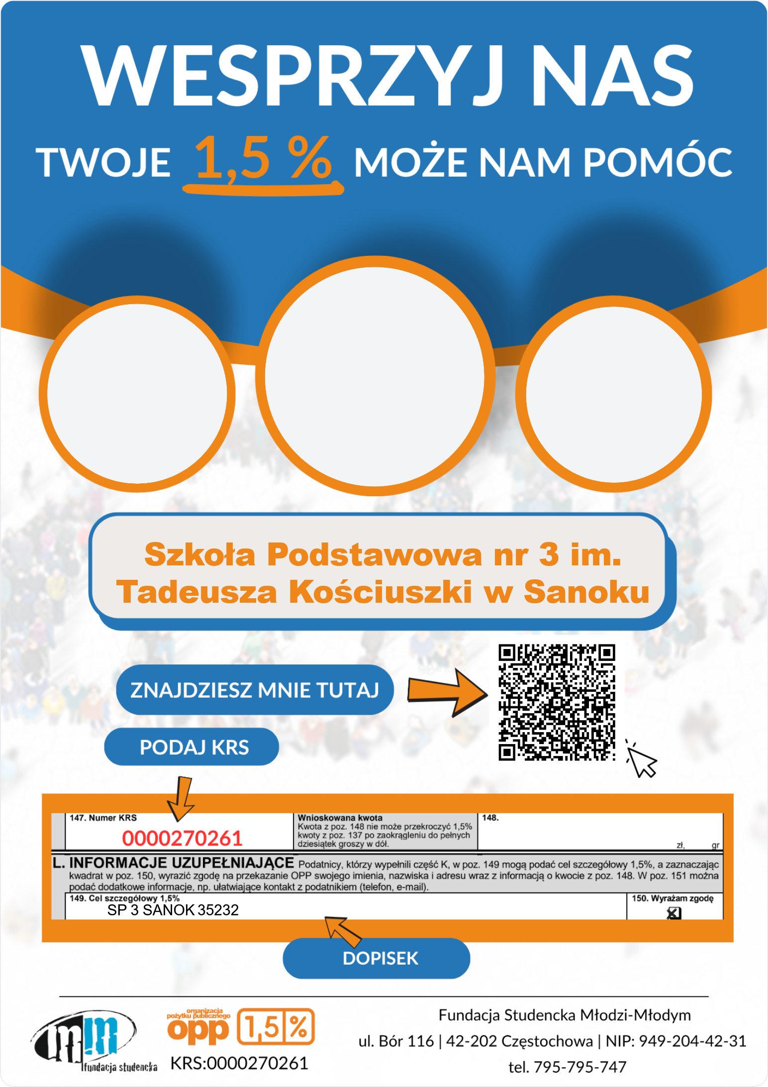 Chcąc przekazać 1,5% podatku na rzecz Szkoły Podstawowej nr 3 im. Tadeusza Kościuszki w Sanoku za pośrednictwem Fundacji Studenckiej należy w formularzu zeznania podatkowego wpisać: