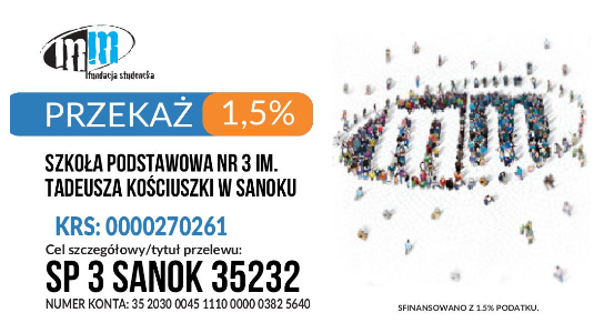 Zachęcamy do przekazania 1,5% podatku na rzecz Szkoły Podstawowej nr 3 w Sanoku